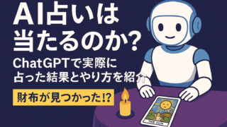 AI AI占いは当たるのか?ChatGPTで実際に占った結果とやり方を紹介 ― 財布が見つかった!?驚きの体験談つき ― AI占いは本当に当たるのか?この記事ではChatGPTを使ったAI占いのやり方と実際の体験談を紹介。タロットで占った結果、驚きの的中で財布が見つかった!?日常に役立つAI占いの始め方を解説します。 2025.08.28 AI