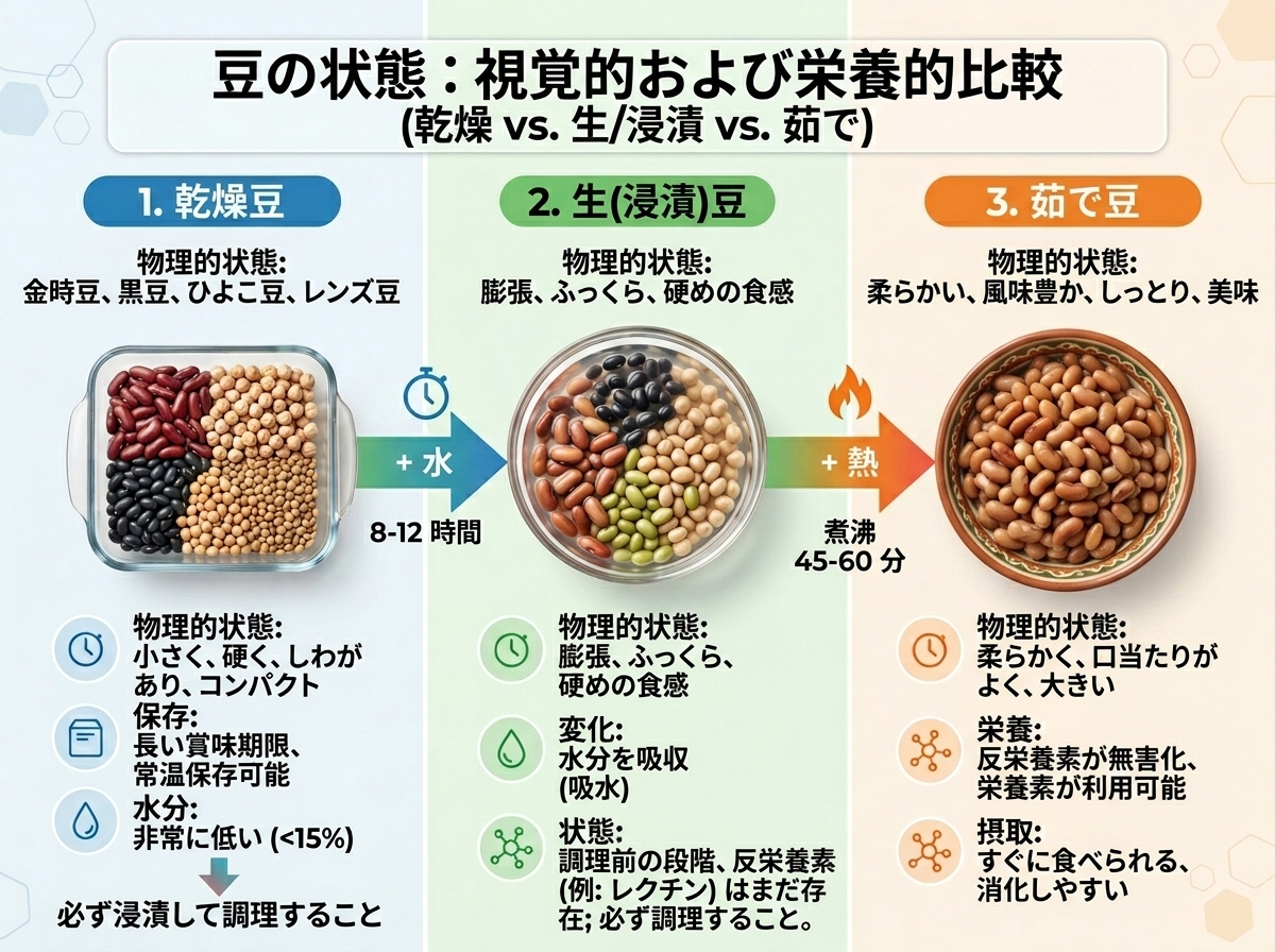 乾燥豆・ゆで豆・蒸し豆では、水分量が大きく変わります。