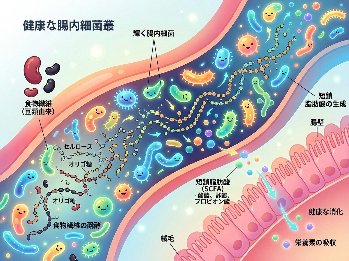 さらに最近の研究では、豆に含まれる食物繊維が腸内細菌に働きかけ、「短鎖脂肪酸」という物質を生み出すことが分かってきました。