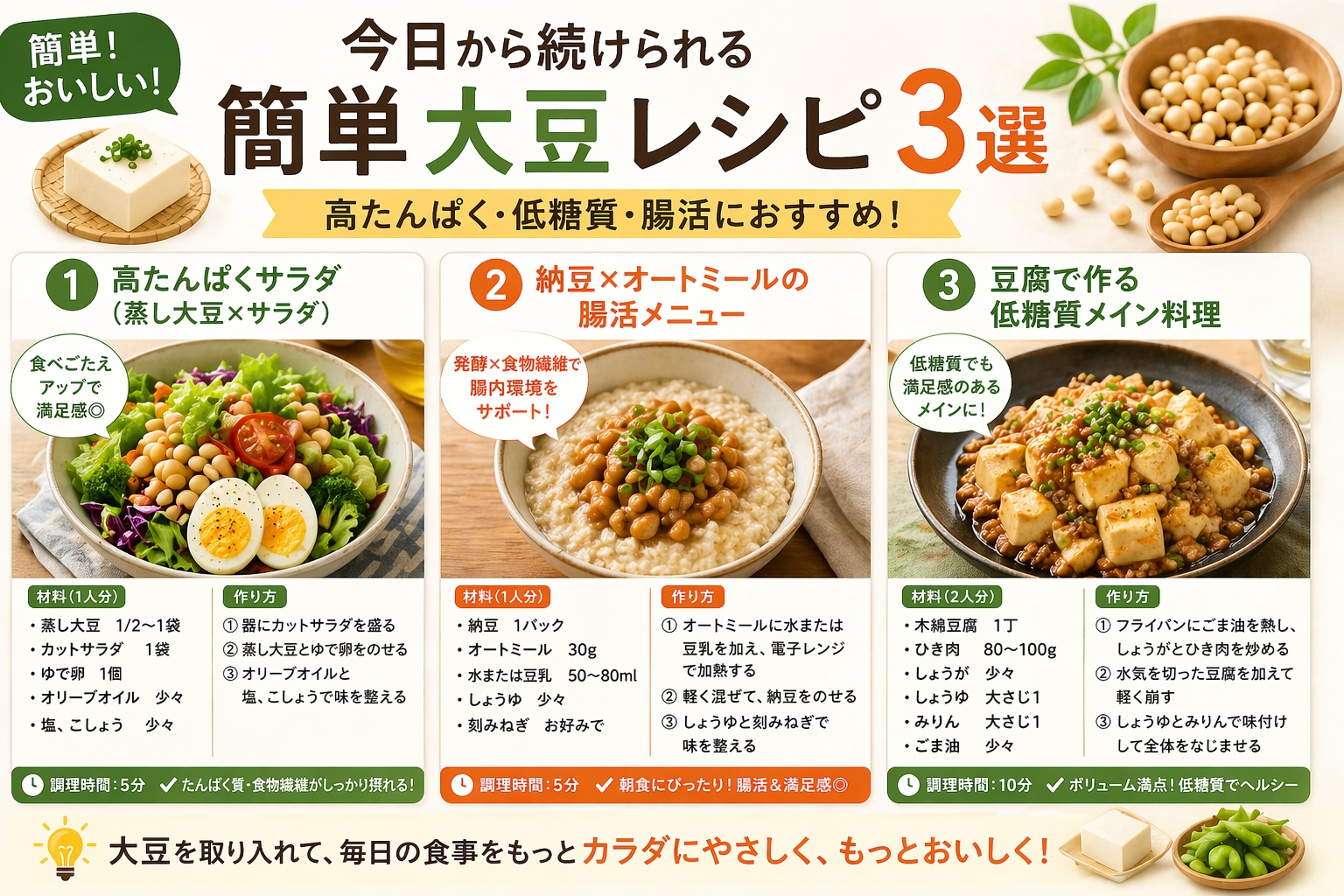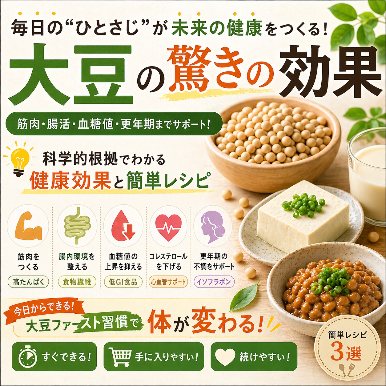 さらに、豆腐・納豆・枝豆の違い、筋トレやダイエットへの活用法、忙しくても続く「大豆ファースト」のコツまで、すぐに実践できる形でお届けします。