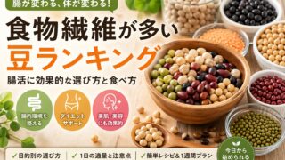 文部科学省「日本食品標準成分表」に基づき、食物繊維が多い豆をランキング化。いんげん豆・ひよこ豆・大豆などの違いや、不溶性・水溶性食物繊維の働き、短鎖脂肪酸との関係を最新研究ベースで解説。腸活・便秘改善・老化防止に役立つ具体的な食べ方と1週間の実践例も紹介。