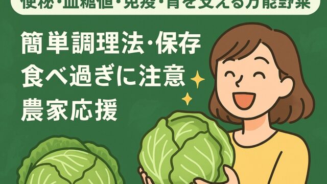 キャベツ キャベツの栄養・効果|便秘・血糖値・免疫力まで!医師もすすめる万能野菜の力2025 キャベツは便秘改善や免疫力アップ、血糖値コントロールにも役立つ万能野菜。ビタミンC・食物繊維・スルフォラファンの健康効果を科学的に解説。 2025.11.06 キャベツ食べ物